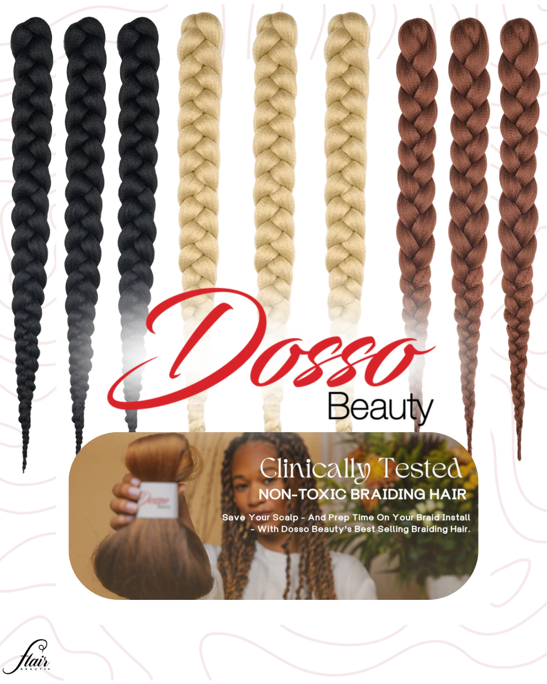 Dosso Beauty’s braiding hair is made from cleansed Kanekalon fiber, free from the toxic chemicals found in 99% of braiding hair on the market. It is clinically tested, dermatologist-approved, hypoallergenic, and safe for sensitive skin.